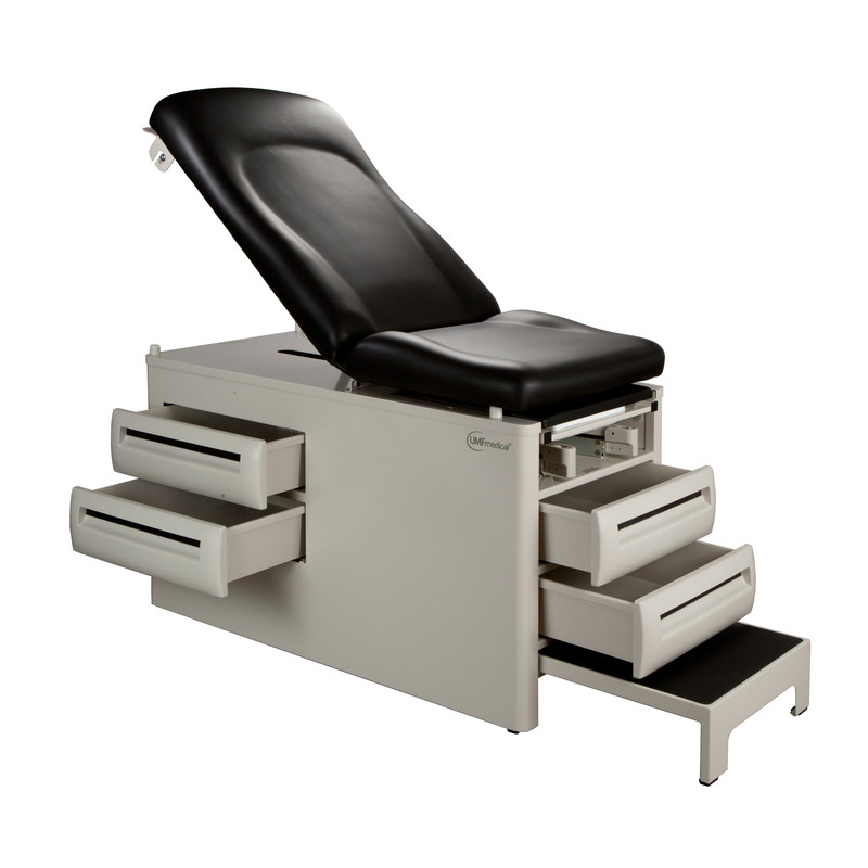 The 5240 comes standard with our removable vacuum formed UMF Medical Ultra Comfort Seamless Top for the ultimate in comfort. It’s also easy to clean and helps prevent cross-contamination. Equipped with Easy-glide comfort stirrups, all-steel slide-out foot step, and a fully articulating back section with gas spring assist, the UMF 5240 exam table is the latest addition to one of our most successful product lines. To further increase the versatility of this table, we also include a slide-out leg section with removable drip pan, and a removable upholstered leg section pad as standard equipment.