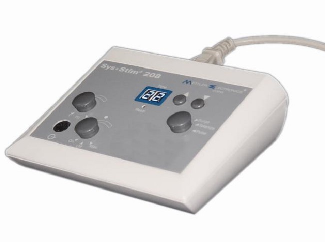 The Sys*Stim 208 is a one channel, low-volt stimulator with Surge, Pulse and Tetanize modes. It has easy-to-operate knobs that control stimulation intensity and frequency, a digital timer and a remote patient cut-off switch. It is a small, portable stimulator with a clinical appearance.