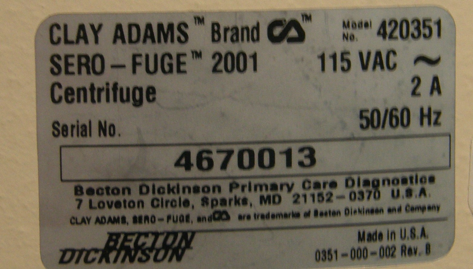 Clay Adams Serofuge 2001 is a cell washer used for blood grouping, blood typing, cross matching, and other cell washing procedures. This cell washer that unites contemporary design with highly functional performance, comes with a plastic rotor to accept 12.7 dia. X 75mm long blood tubes.