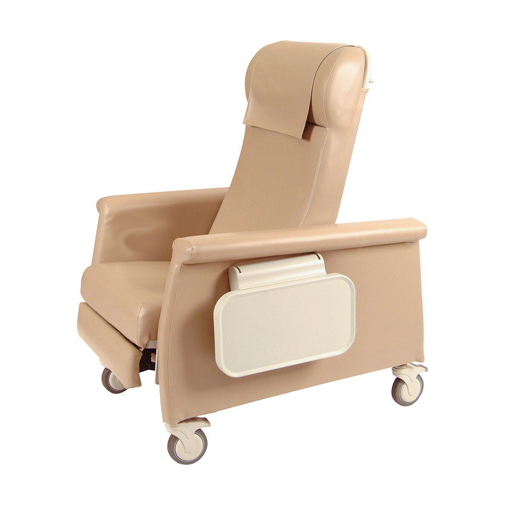 The 6900 Elite CareCliner features smooth seamless upholstery that does not collect fluids and is easily cleaned and an infinitely adjustable back. The leg rest extends automatically and three positions can be attained by the user. Beginning in 2008, the non-porous blow molded fold down side tray comes standard on both the right and left sides. Each chair in the CareCliner Series features a standard Trendelenburg release with handle accessible from either side. It also has a built-in ergonomic headrest, wide elastic band on the back frame that provides exceptional comfort and an elastic open seat base. All of these features combine to create the ultimate in comfort, durability and value. Also available in Extra Large – See our 6910.